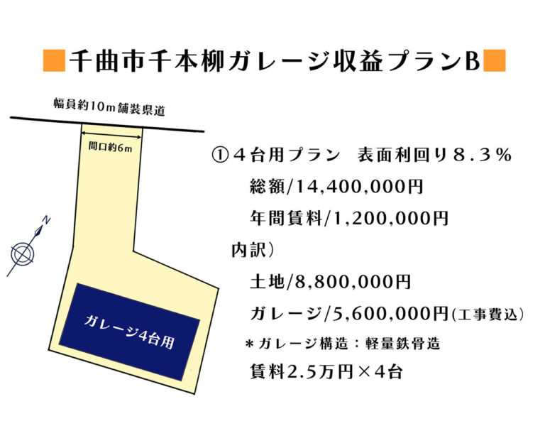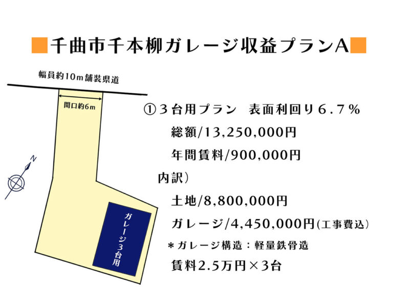 五加小至近・県道沿い、当社開発・販売中の千曲市千本柳分譲地に貸ガレージ2タイプをプランニングしました!ご興味ある方はお気軽にお問い合わせ下さい!
